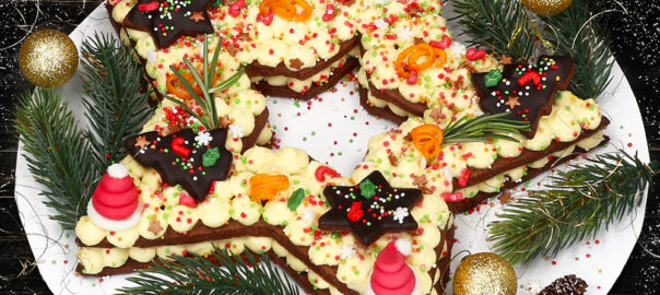Zunächst setzen Sie Cremetupfen auf den ersten Stern. Danach legen Sie den zweiten Stern darauf. Anschließend setzen Sie neue Tupfen. Außerdem dekorieren Sie die Tarte mit Sprinkles, Rosmarin und Orangenzesten. Schließlich ergänzen Sie die Nikolaus-Mützen.